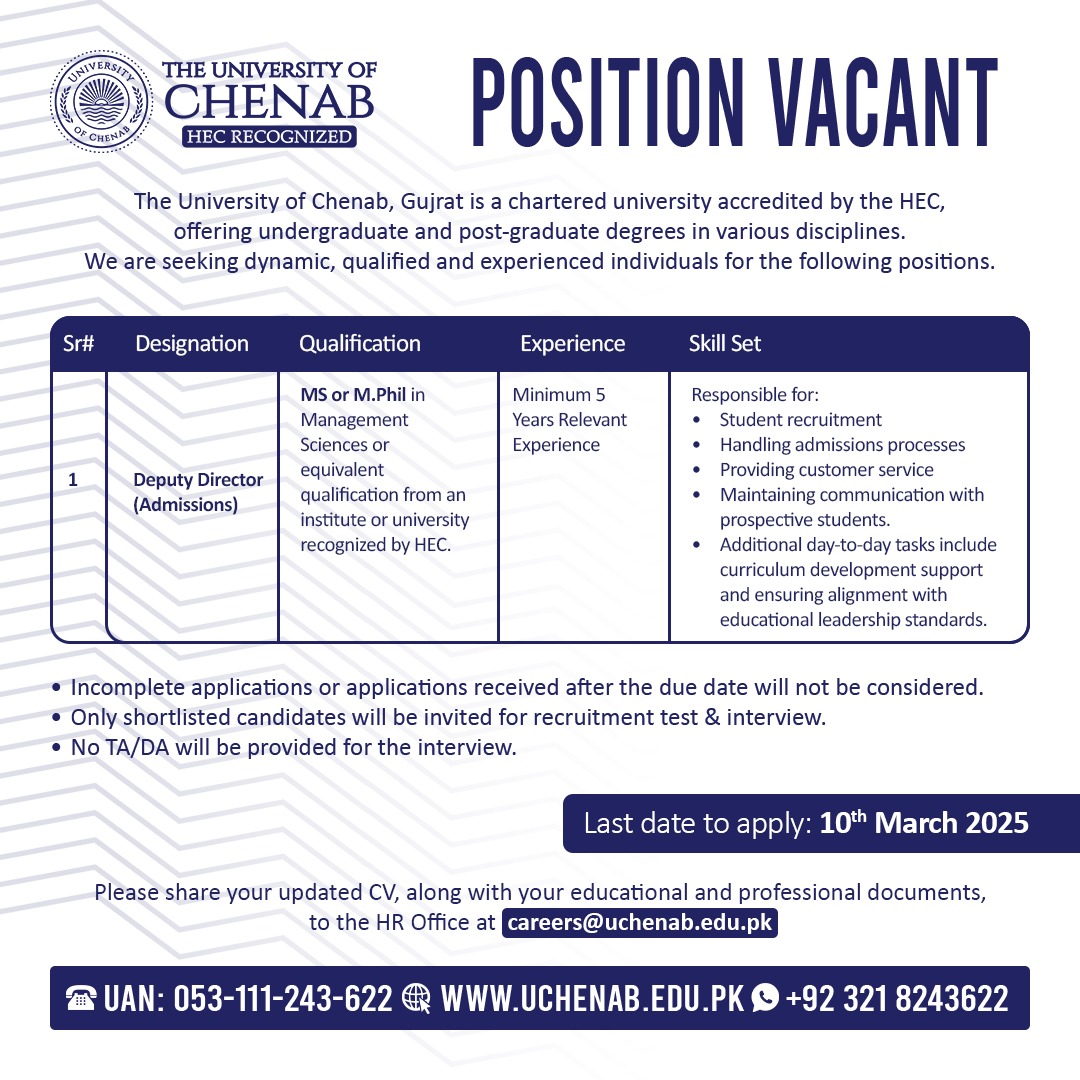 EduJobs Pakistan is an independent platform dedicated to providing information about education sector job opportunities in Pakistan, sourced from prominent newspapers and official institution channels. Our goal is to assist job seekers nationwide by delivering timely updates on available positions. As a precaution, refrain from making any payments if an employer requests fees for activities such as shortlisting or interviews. Ensure that you apply according to the instructions and dates specified in the original job advertisement. EduJobs Pakistan is not liable for inaccuracies or misrepresentations in job ads. If you have any uncertainties, we recommend visiting the institution’s official website or contacting them through their official contact numbers for verification. Please note, EduJobs Pakistan operates independently and is not affiliated with any government entity.