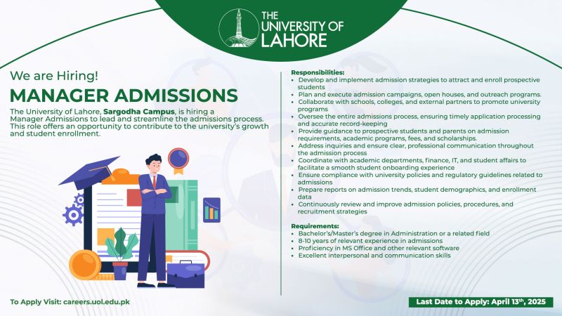 Join our team! The University of Lahore, Sargodha Campus, is hiring a Manager Admissions to lead and optimize the admissions process. Be part of our journey in shaping student success!