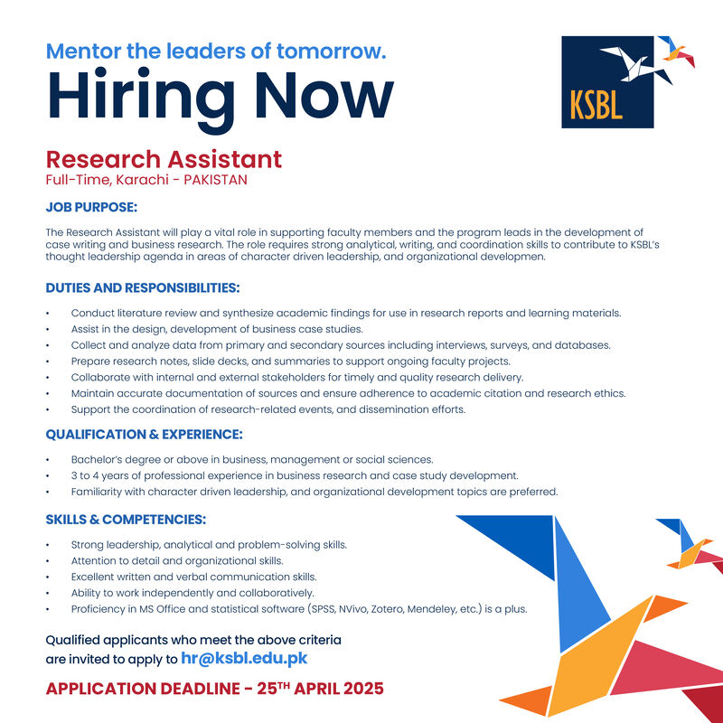 Exciting Career Opportunity at KSBL! We’re hiring a Full-Time Research Assistant to join our mission of mentoring the leaders of tomorrow. This role offers a unique chance to play a pivotal part in supporting faculty members and advancing KSBL’s thought leadership agenda through impactful research, case writing, and organizational development.