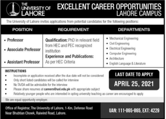 UOL-The University of Lahore, Teaching/Faculty Jobs April 2021