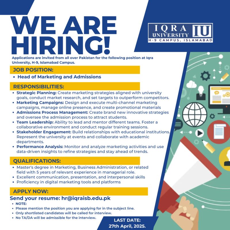 To apply please send your resume on: hr@iqraisb.edu.pk