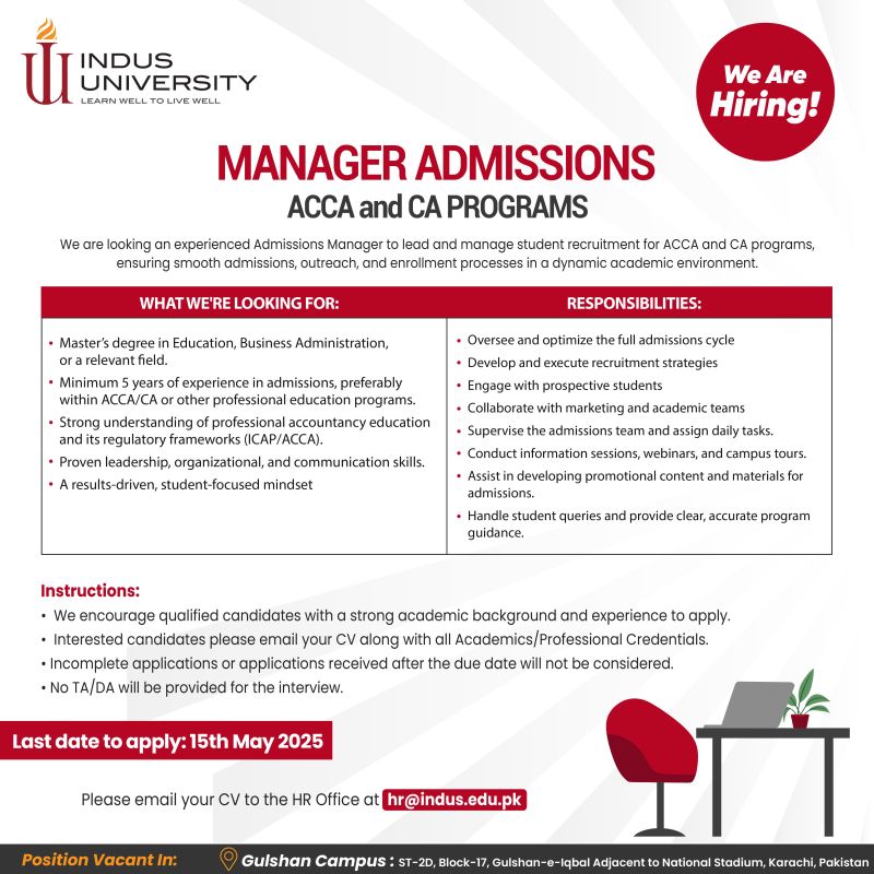 Indus is hiring Manager Admissions for ACCA & CA Programmes!