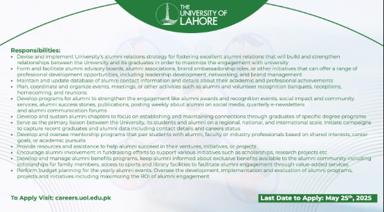The University of Lahore is looking for a dynamic and visionary professional to join us as the Head of Alumni Relations. This role is all about building lasting connections, fostering a strong sense of community among our graduates, and creating opportunities that bring alumni closer to their alma mater. Come be part of a university that's shaping futures and celebrating legacies every step of the way.