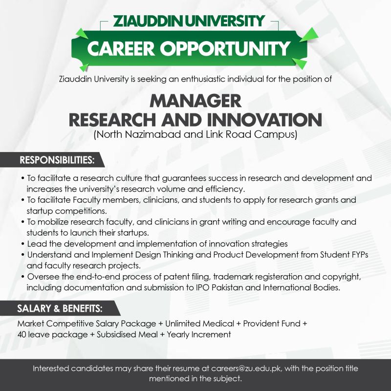 Manager Research and Innovation Job at Ziauddin University