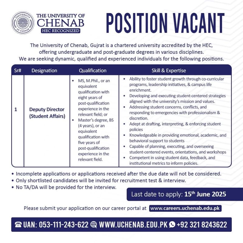🎓 Deputy Director (Student Affairs) Job at University of Chenab – Apply by June 15, 2025