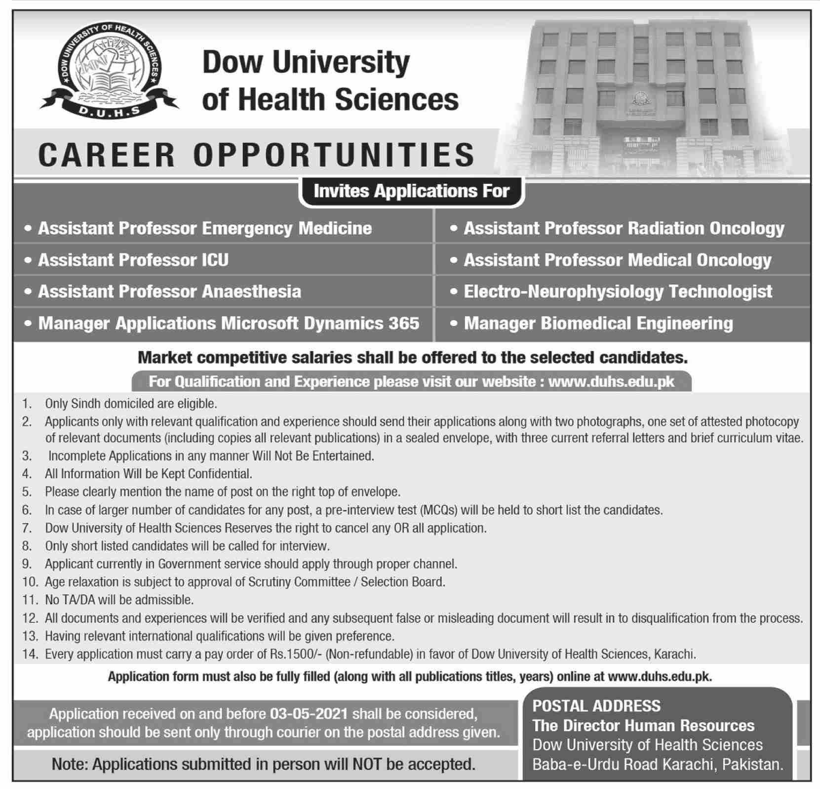 DUHS-Dow University of Health Sciences, Teaching/Faculty & Management Jobs April 2021