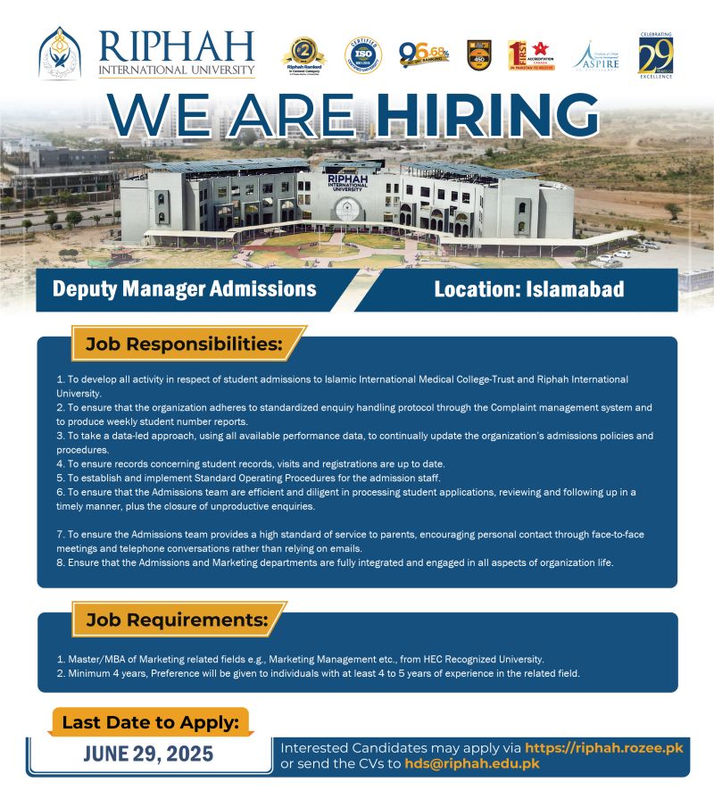 Deputy Manager Admissions Job at Riphah International University