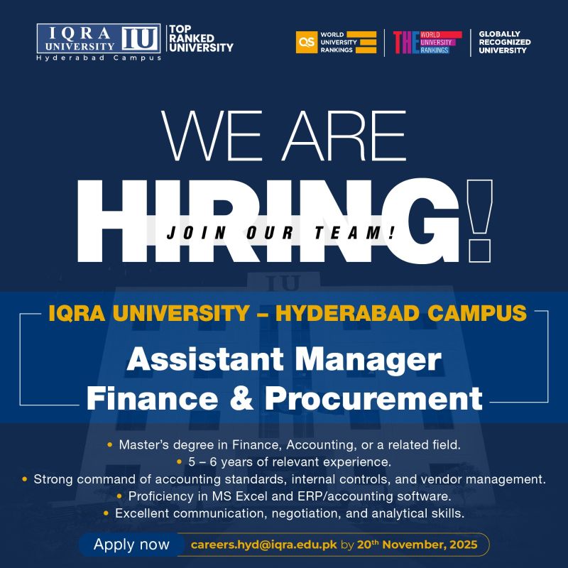 Iqra University – Hyderabad Campus is seeking qualified and passionate individuals for the position of Assistant Manager - Finance & Procurement.