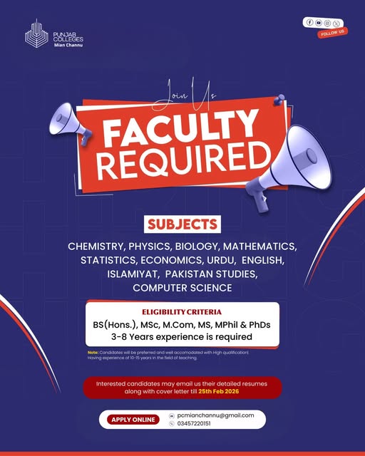 #PunjabColleges #MianChannu #TeachingJobs #HiringTeachers #Education #JobOpportunity #Career #ApplyNow #TeachersWanted #AcademicJobs #JobVacancy #CollegeJobs #TeachingCareers #PakistanEducation