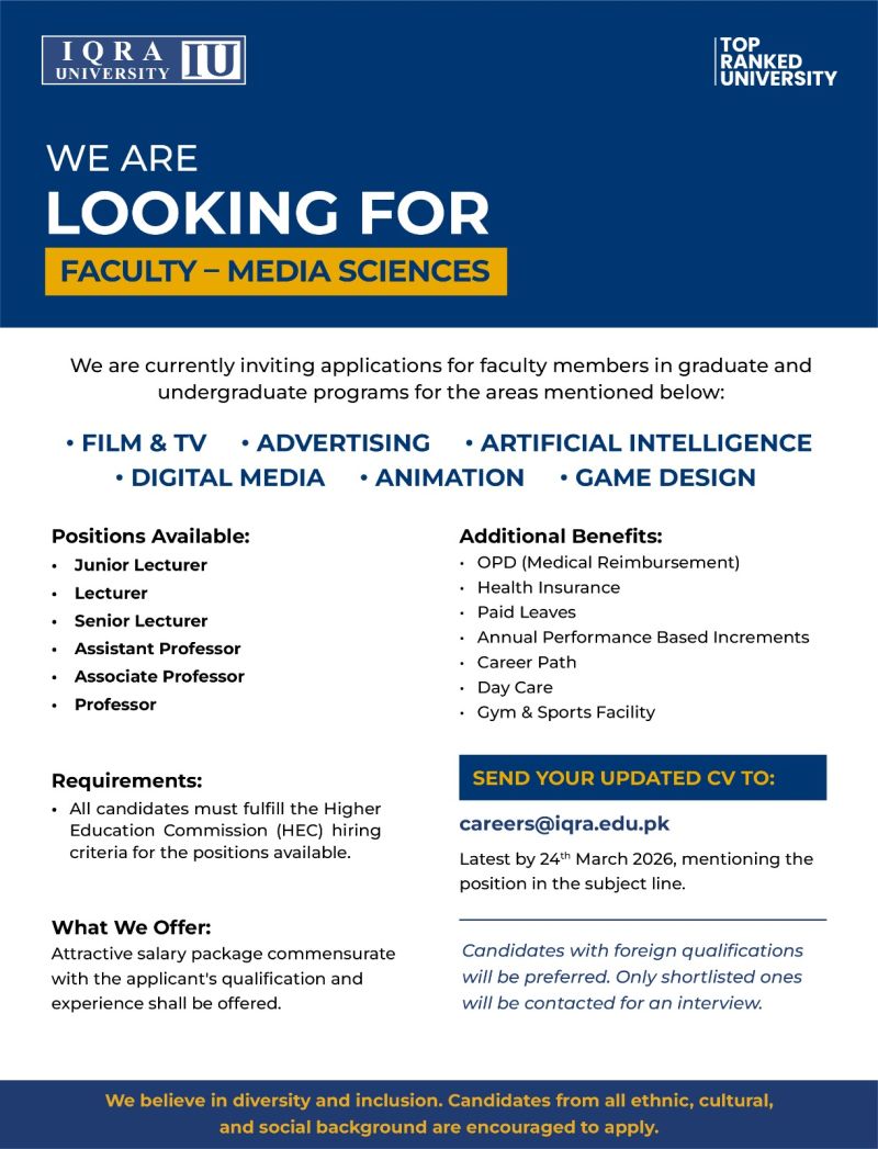 Iqra University is expanding its academic excellence and invites passionate educators to join our Faculty of Media Sciences. We are looking for dedicated professionals who are eager to inspire, innovate, and contribute to the evolving world of media and technology.