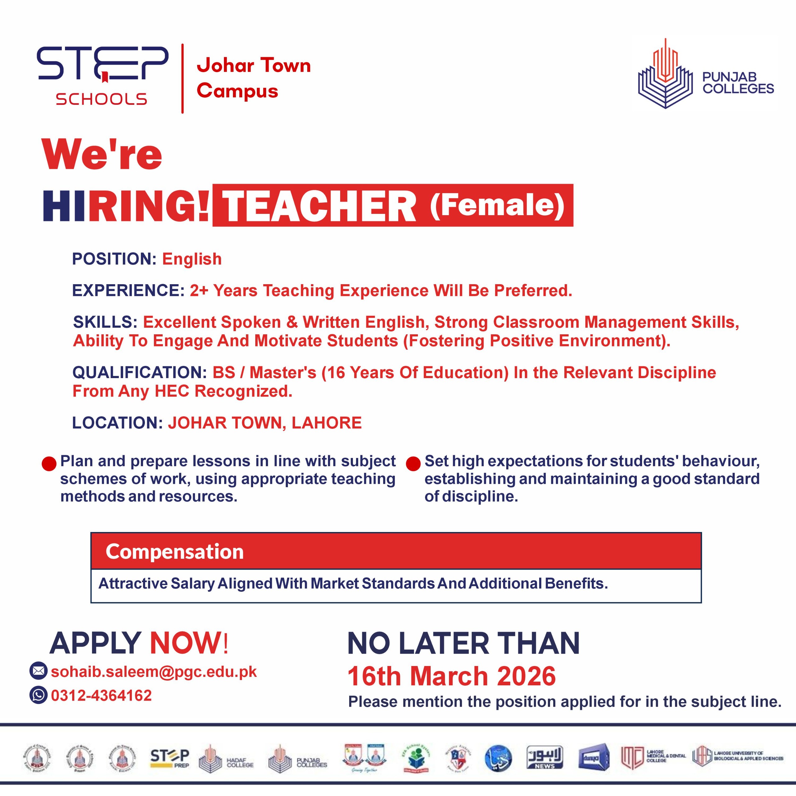 STEP School Johar Town, Lahore is hiring active and energetic female teacher for the "English"