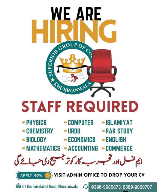 Superior Group of Colleges Khurrianwala is looking for passionate and qualified individuals to join our team!