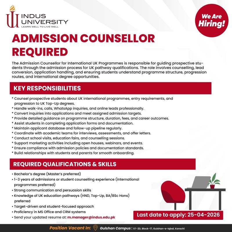 Addmission Counsellor Job at Indus University