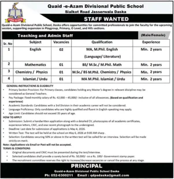 Teaching Jobs at Quaid e Azam Divisional Public School