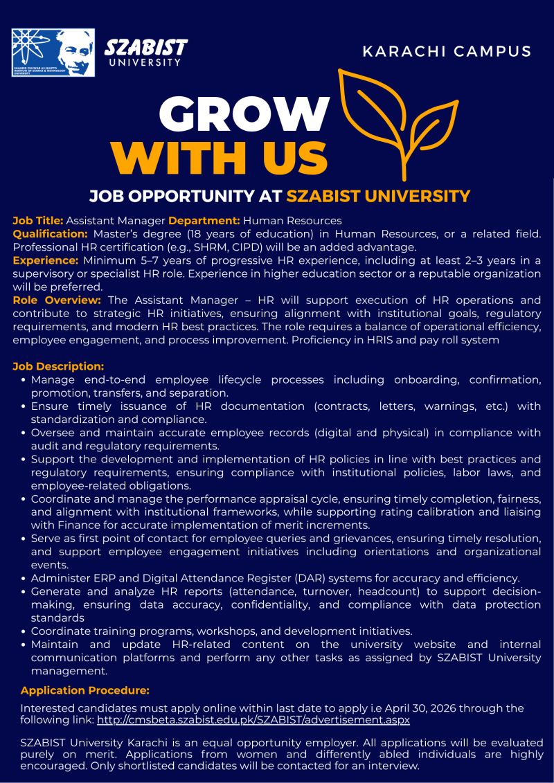 Candidates must apply through this link https://lnkd.in/dyeugEMW by 📆 April 30, 2026. SZABIST University Karachi is an equal opportunity employer. All applications will be evaluated purely on merit. Applications from women and differently abled individuals are highly encouraged. Only shortlisted candidates will be contacted for an interview. #SZABISTUniversity #KarachiCampus #ApplyNow #JobOpportunities
