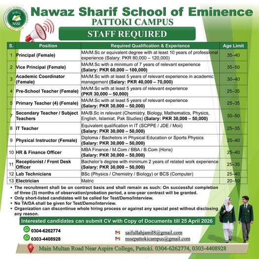 Are you a passionate educator or a dedicated professional looking to make an impact? Nawaz Sharif School of Eminence, Pattoki Campus is hiring for multiple positions!