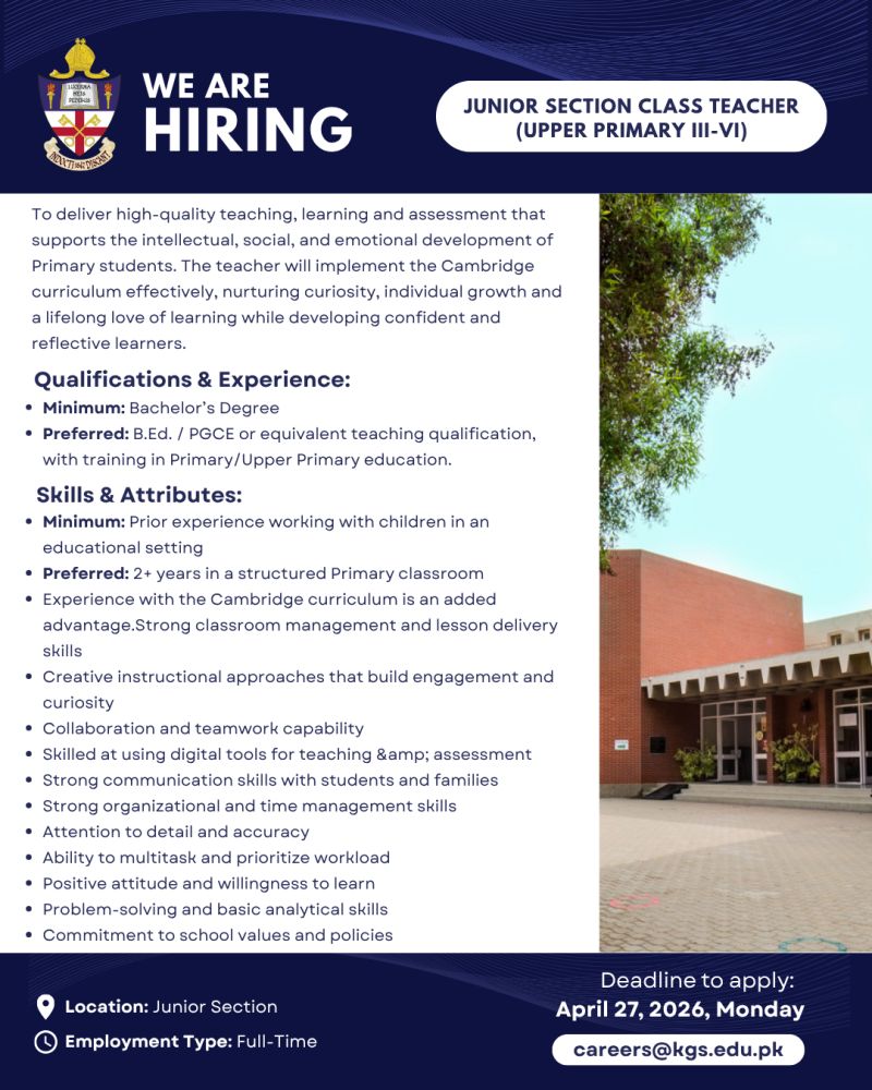 📍 Karachi Grammar School looking for a dedicated educator to deliver high-quality teaching and foster the intellectual, social, and emotional development of our Primary students.