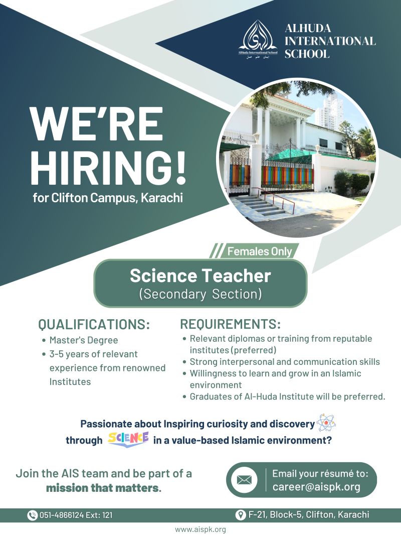 AlHuda International School is seeking a passionate Science Teacher to be an integral part of our Clifton Campus, inspiring curiosity and discovery in students while fostering a values-based Islamic learning environment.