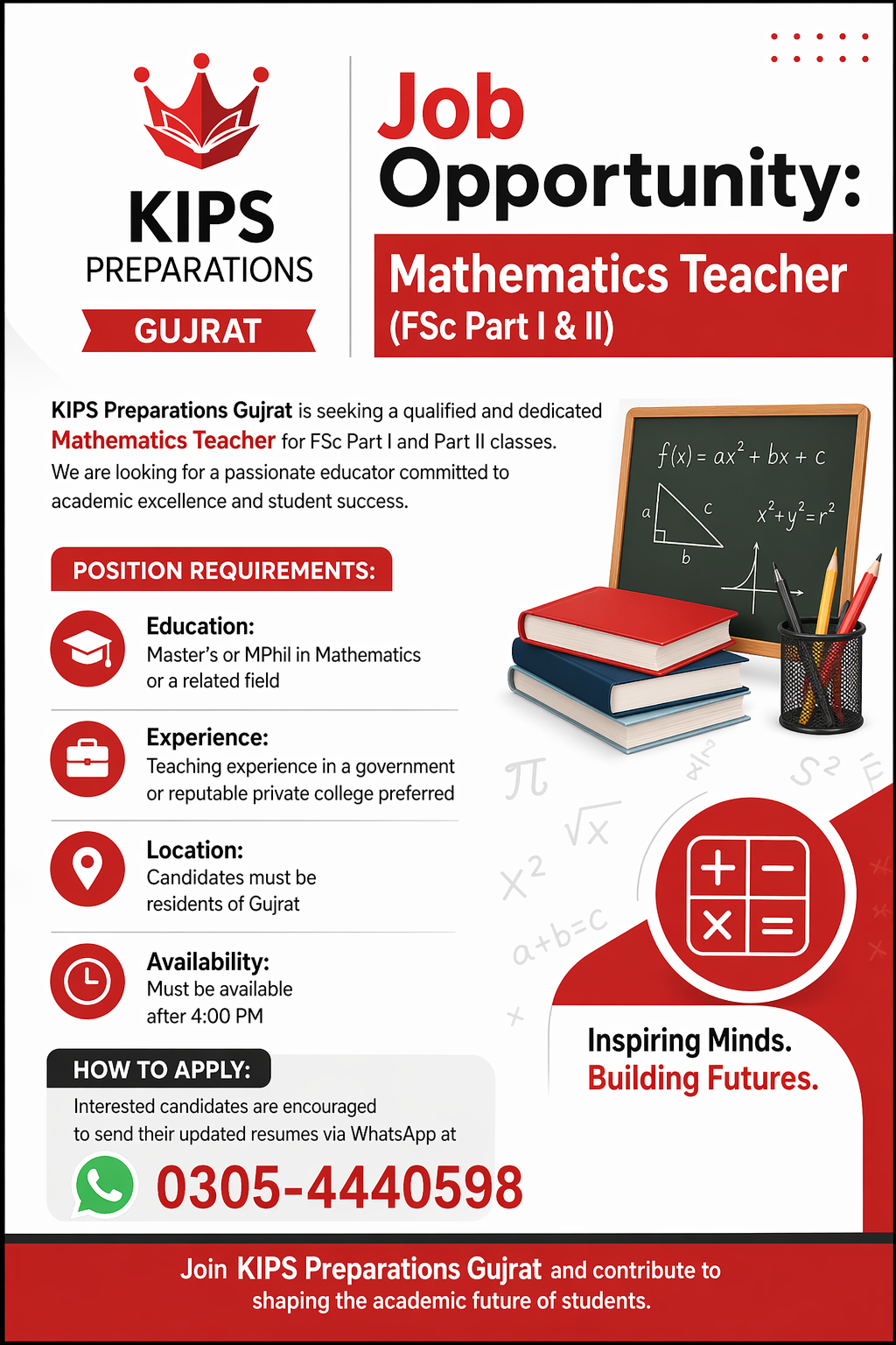 *KIPS Preparations Gujrat* is seeking a qualified and dedicated *Mathematics Teacher* for FSc Part I and Part II classes. We are looking for a passionate educator committed to academic excellence and student success.