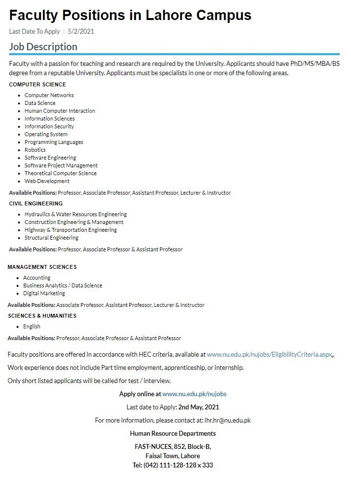 FAST National University Lahore Jobs, Teaching/Faculty Positions April 2021