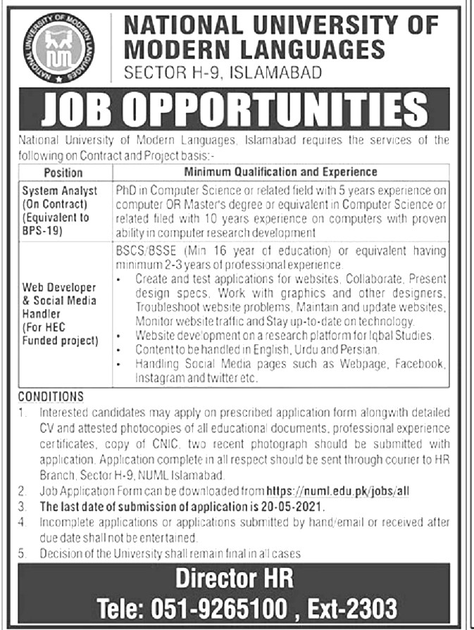 NUML - National University of Modern Languages Jobs, Management Positions May 2021