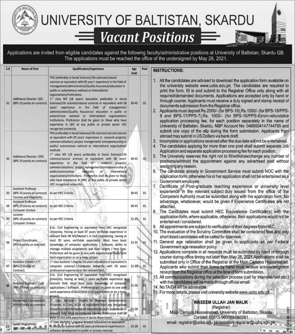 UOB - University of Baltistan Skardu Jobs, Teaching/Faculty & Management Positions May 2021