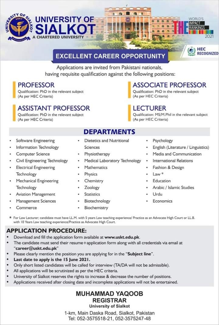 USKT - University of Sialkot Jobs, Teaching/Faculty Positions May 2021