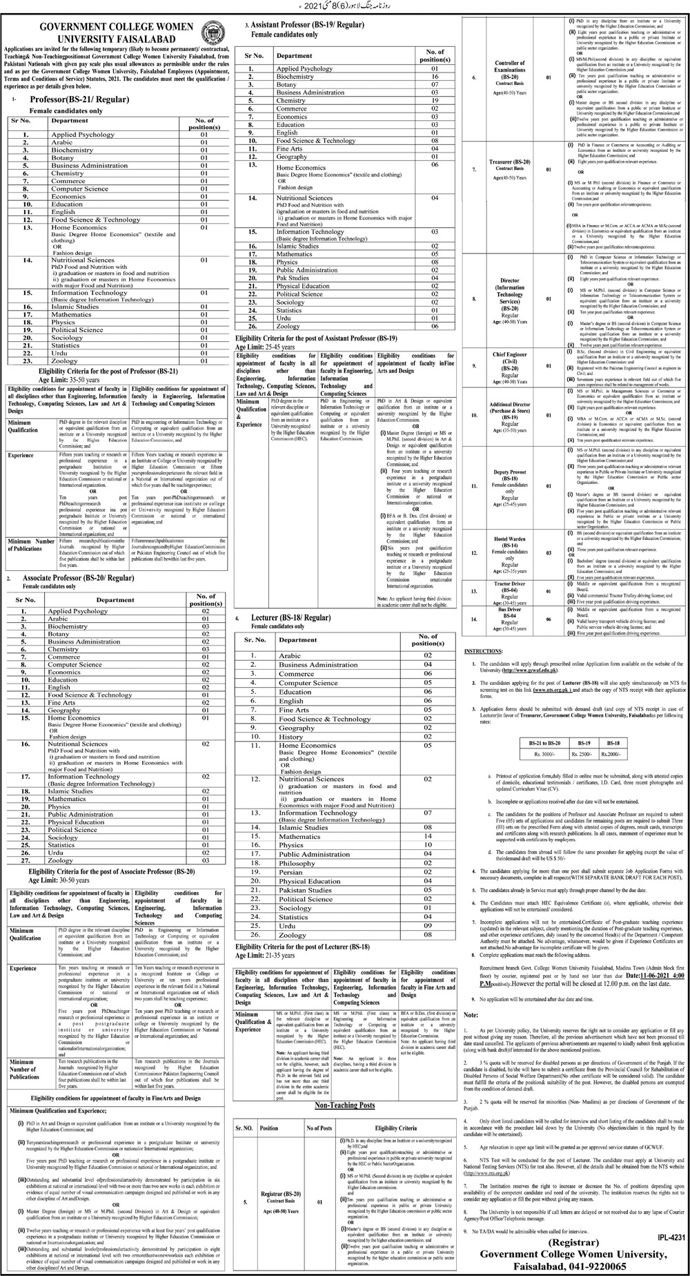 GCWUF - Govt College Women University Faisalabad Jobs, Teaching/Faculty & Management Positions May 2021
