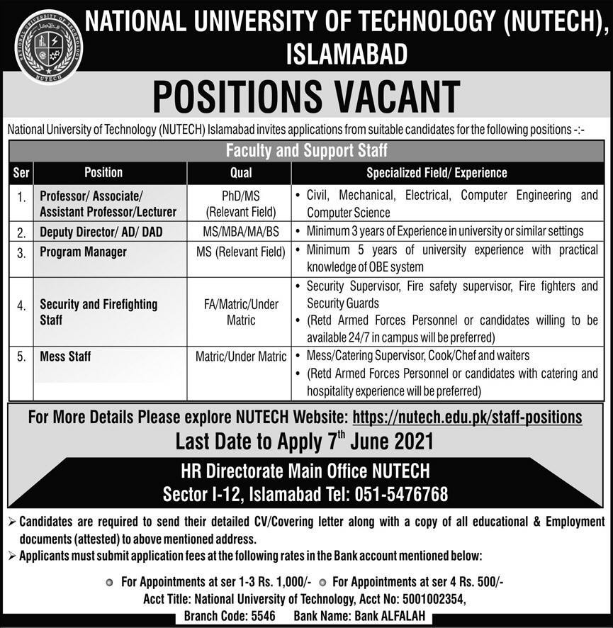 NUTECH - National University of Technology Jobs, Teaching/Faculty & Management Positions May 2021