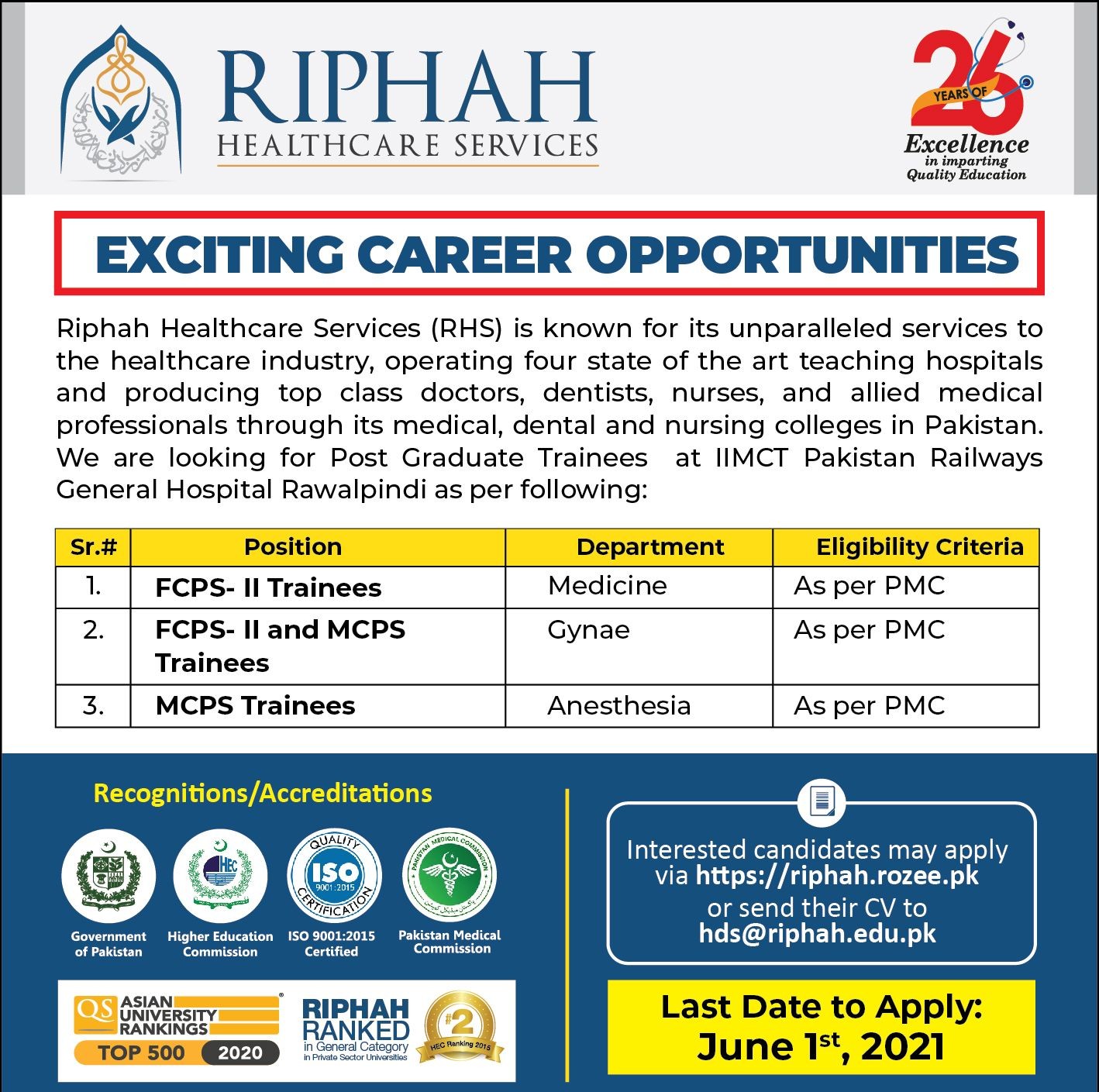 Ripha International University Jobs, Teaching/Faculty Positions May 2021