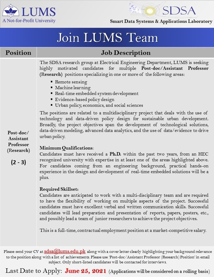 LUMS - Lahore University of Management Sciences Jobs, Teaching/Faculty Positions May 2021