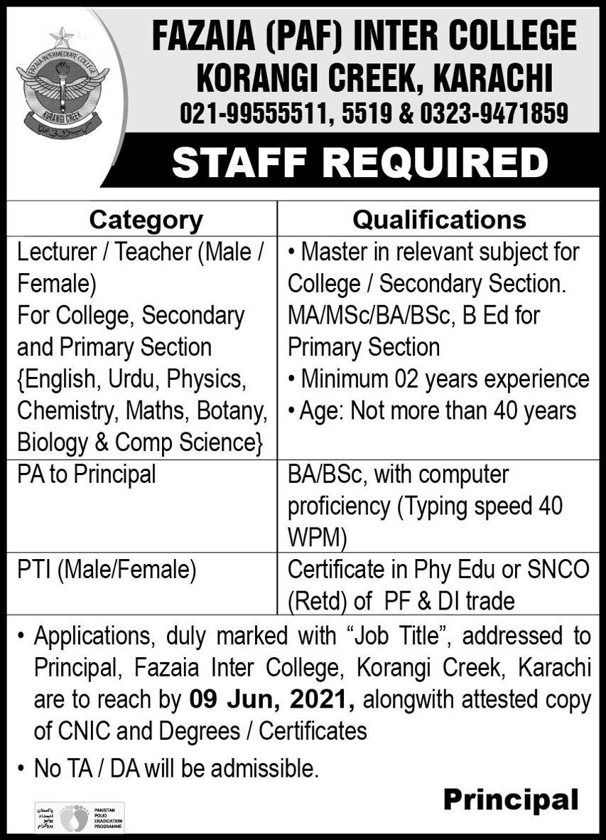 Fazaia Inter College Jobs, Teaching/Faculty Positions May 2021