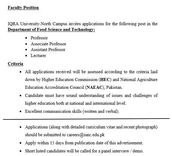 Iqra University Jobs, Teaching/Faculty Positions June 2021