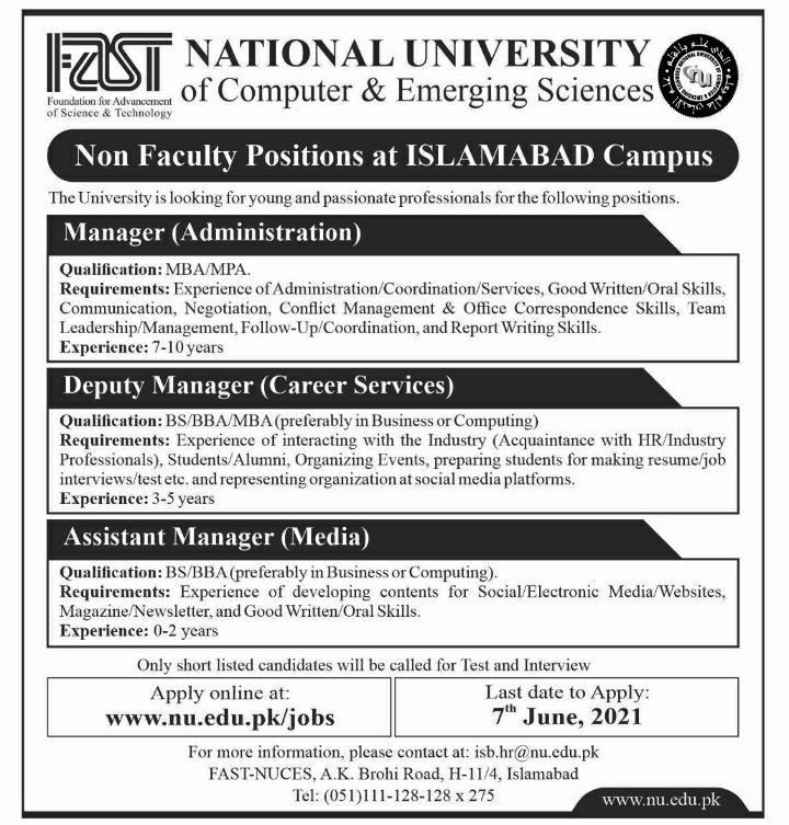 FAST National University Islamabad Jobs, Management Positions June 2021