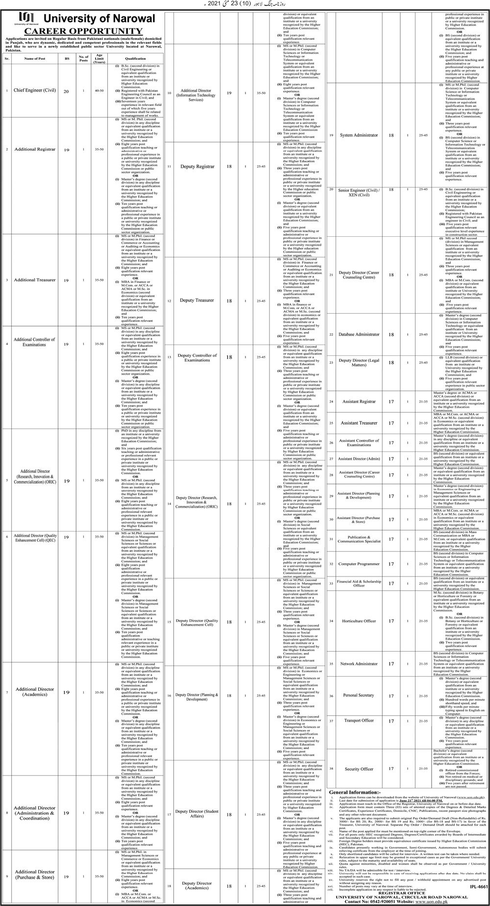 UON - University of Narowal Jobs, Management Positions June 2021