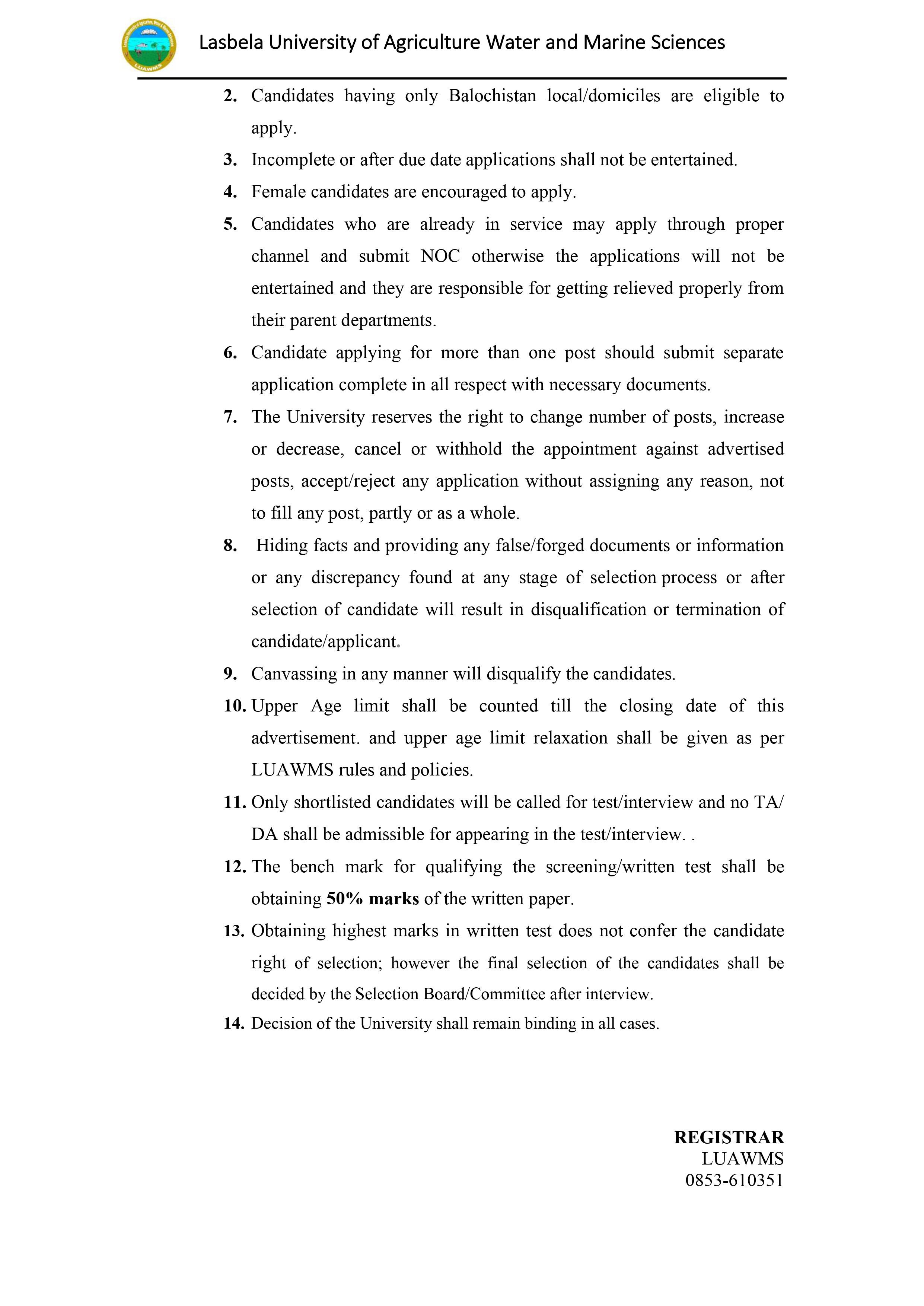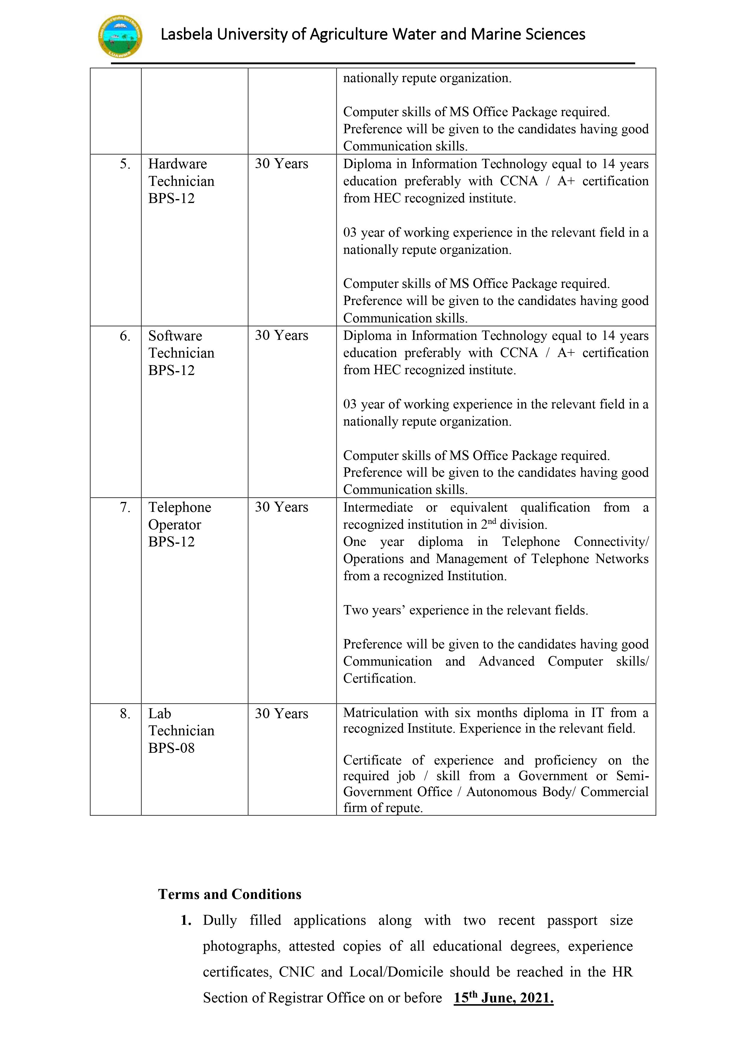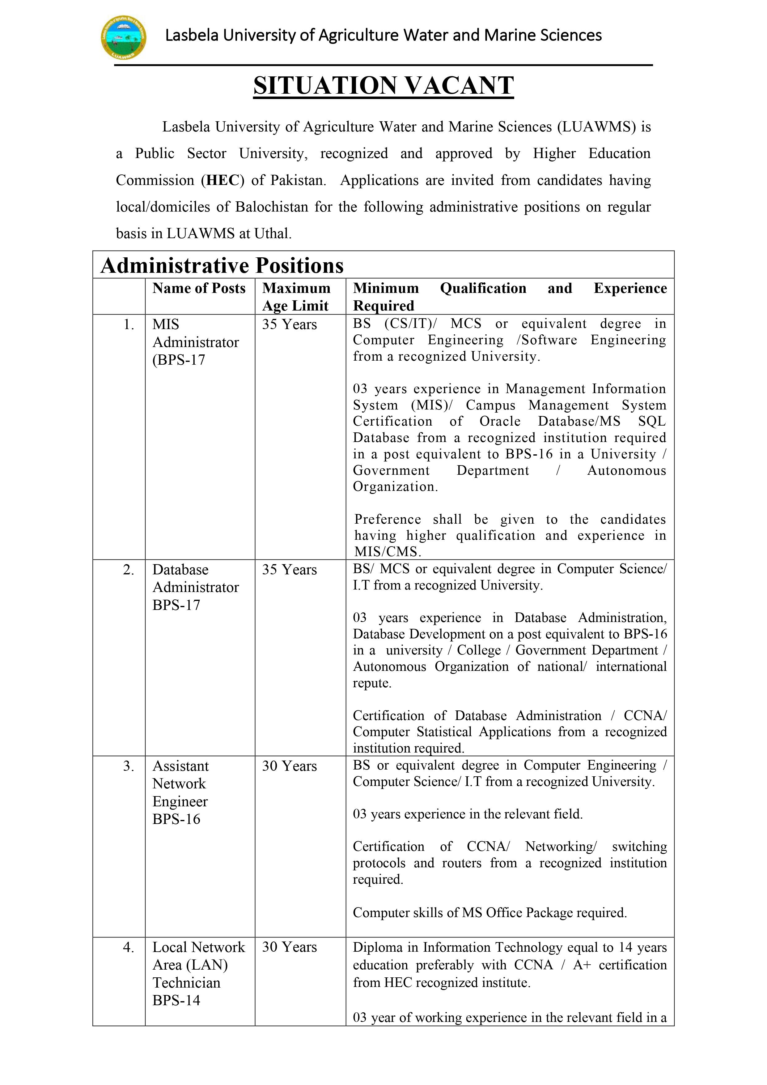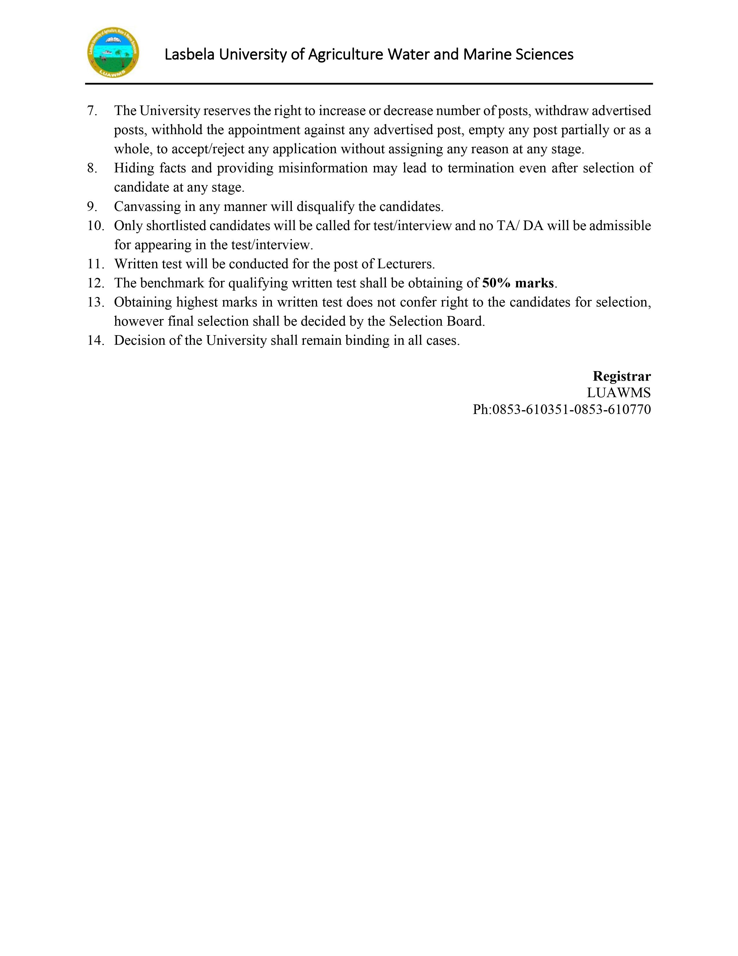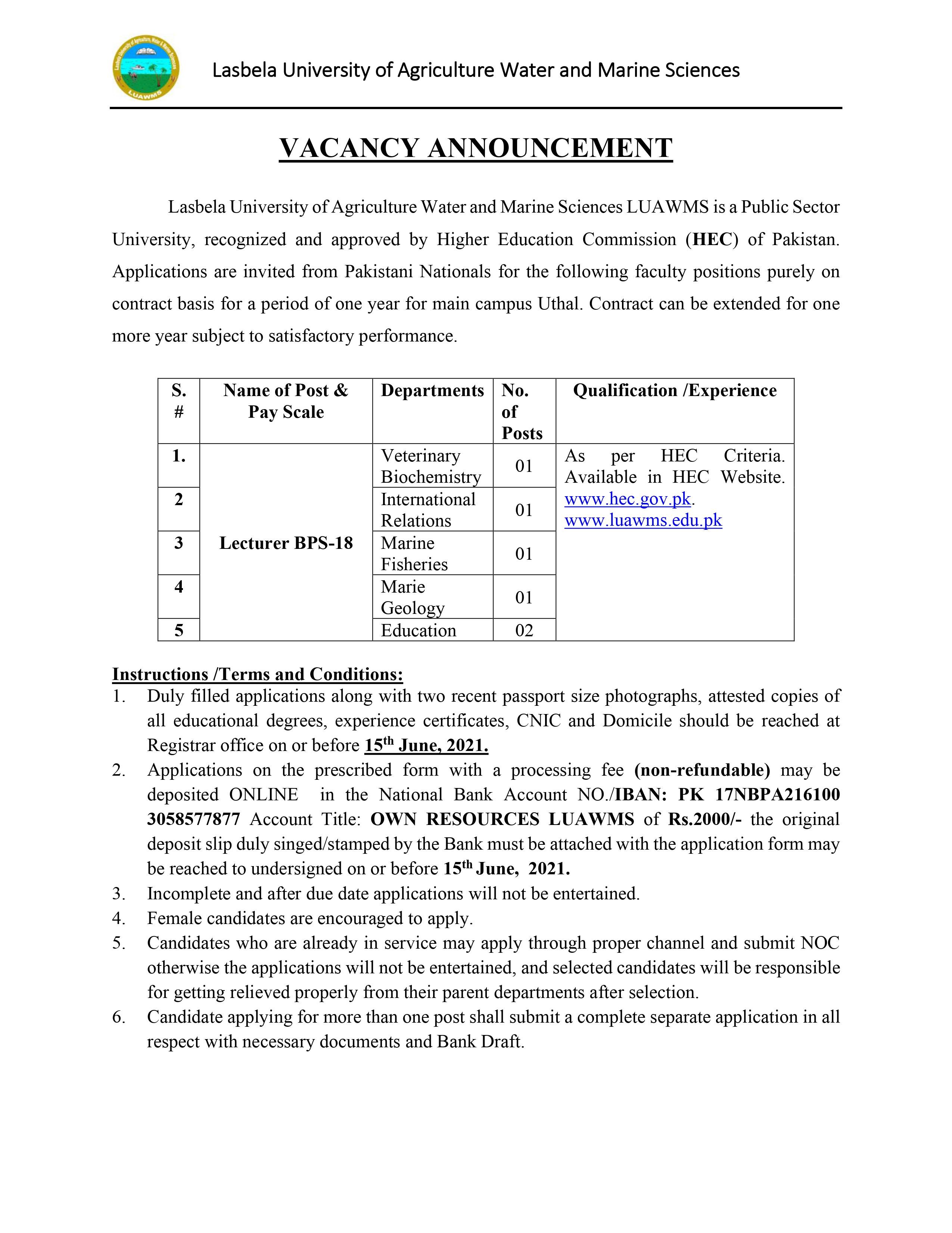 LUAWMS - Lasbela University of Agriculture Water and Marine Sciences Jobs, Teaching/Faculty & Management Positions June 2021