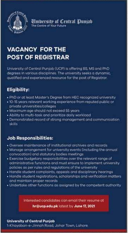 UCP - University of Central Punjab Jobs, Management Positions June 2021