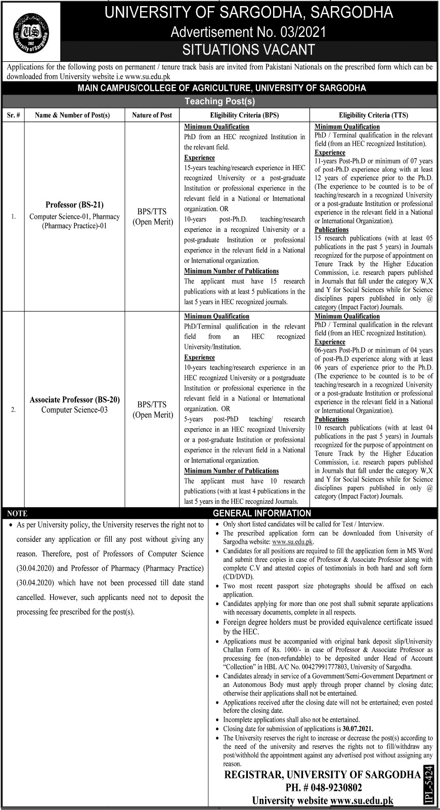 UOS - University of Sargodha Jobs, Teaching/Faculty Positions June 2021