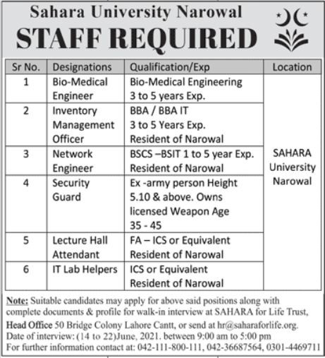 SMCN - Sahara Medical College Narowal Jobs, Management Positions June 2021