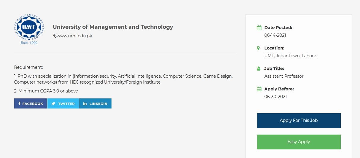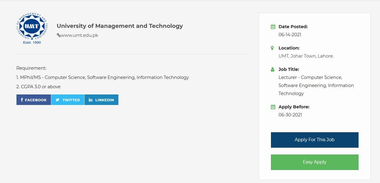 UMT - University of Management & Technology Jobs, Teaching/Faculty Positions June 2021