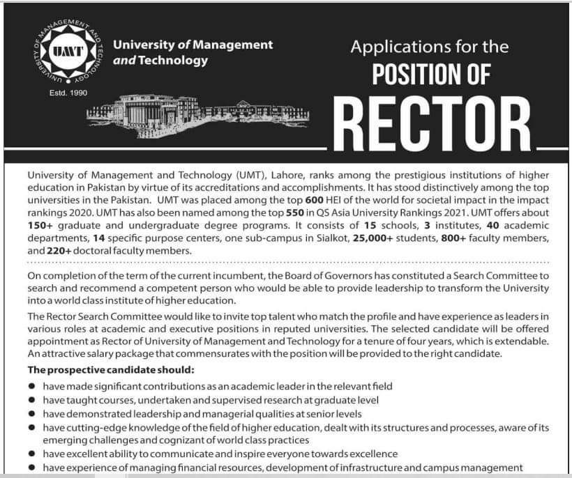 UMT - University of Management & Technology Jobs, Management Positions June 2021
