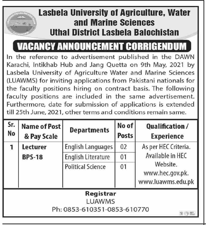 LUAWMS - Lasbela University of Agriculture Water and Marine Sciences Jobs, Teaching/Faculty Positions June 2021