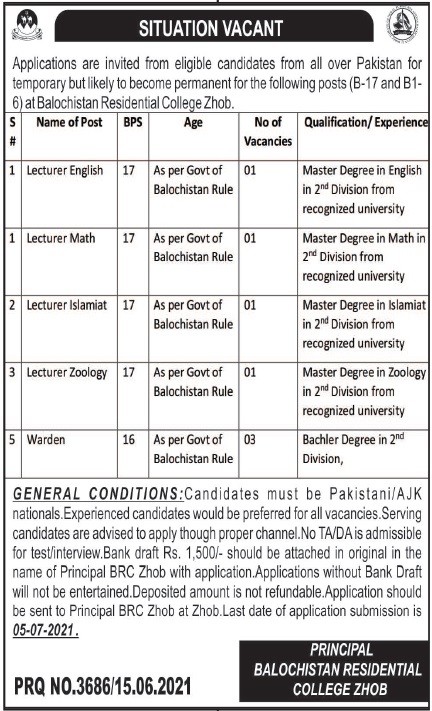 Baluchistan residential college zhob Jobs, Teaching/Faculty & Management Positions June 2021