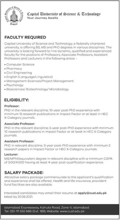 CUST - Capital University of Science & Technology Jobs, Teaching/Faculty Positions June 2021