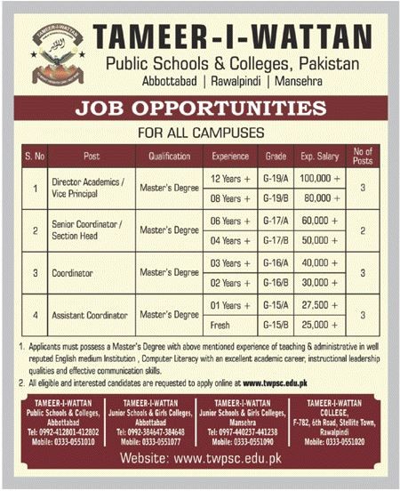 Tameer-i-wattan Public Schools & Collegges Jobs, Management Positions June 2021