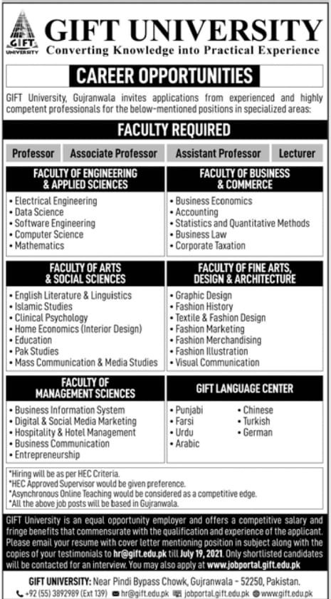 GU - GIFT University Jobs, Teaching/Faculty Positions June 2021