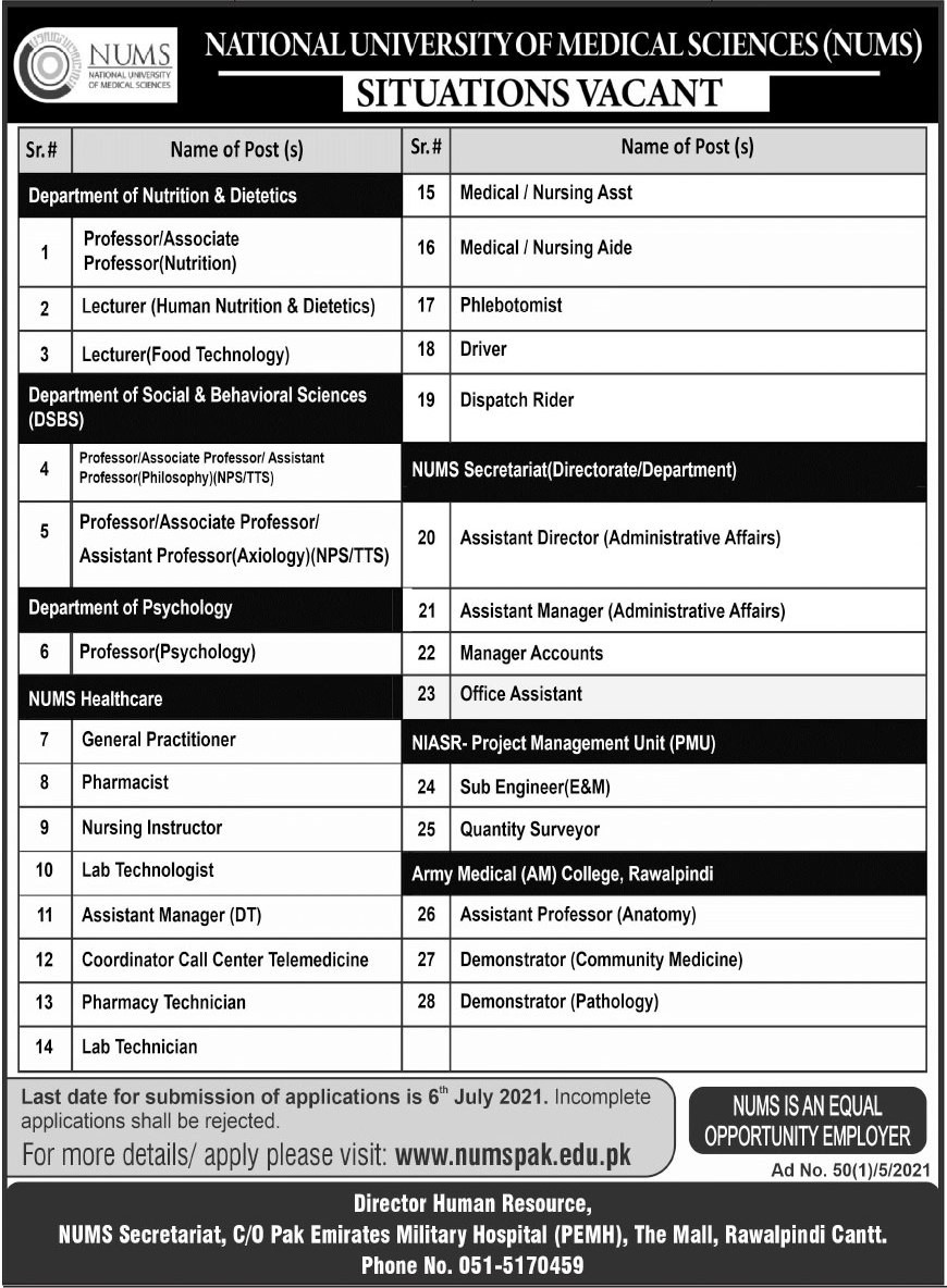 NUMS - National University of Medical Sciences Jobs, Teaching/Faculty & Management Positions June 2021