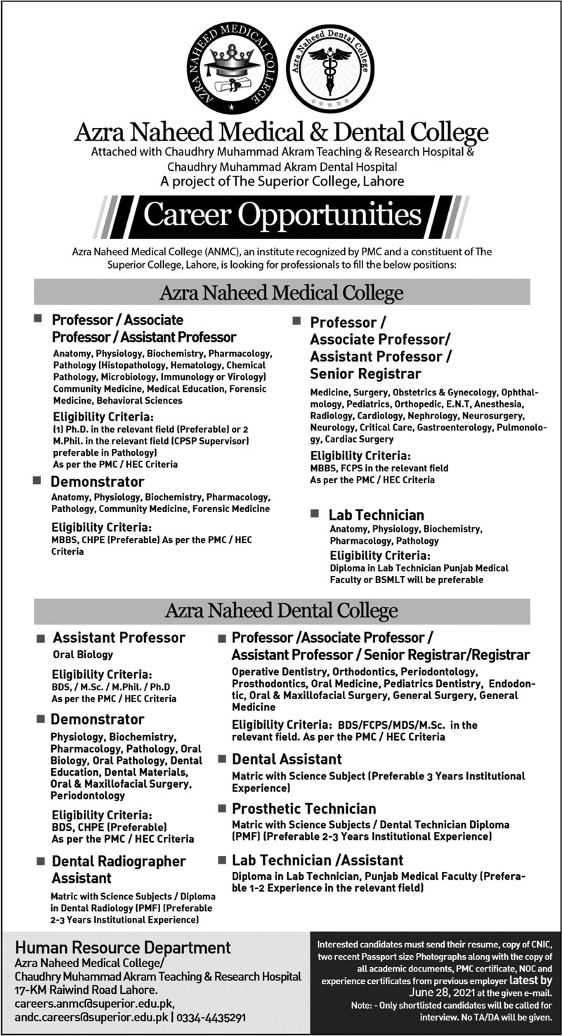 ANMC - Azra Naheed Medical College Jobs, Teaching/Faculty & Management Positions June 2021