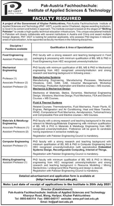PAF-Pak-Austria Fachhochschule Institute of Applied Sciences and Technology Jobs, Teaching/Faculty Positions June 2021