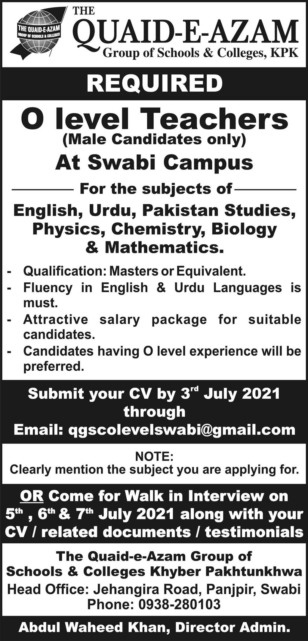 Quaid-e-Azam Group Of Schools And Colleges Jobs, Teaching/Faculty Positions June 2021